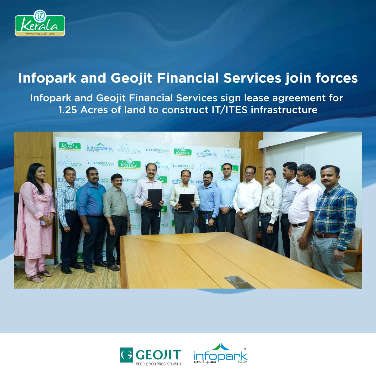 Infopark is glad to associate with Geojit Financial Services Ltd, which is gearing up to construct IT/ ITES infrastructure on a 1.25 acre-land in Infopark Kochi Phase 2. Shri. Susanth Kurunthil, CEO of Infopark, and Shri. C J George, Managing Director of Geojit, entered into a lease agreement of the land, which will see infrastructure with 1.25 lakh sq.ft. built-up area to develop data centre, software lab, software services, backend operations, etc. A delegation of executive members from Geojit, comprising Mr. A Balakrishnan, Executive Director, Mr. Satish Menon, Executive Director, Mr. Jones George, Executive Director, and Ms. Mini Nair, Chief Financial Officer and officials of Infopark attended the lease signing ceremony on Wednesday, February 8, 2023 at Infopark Park Centre.