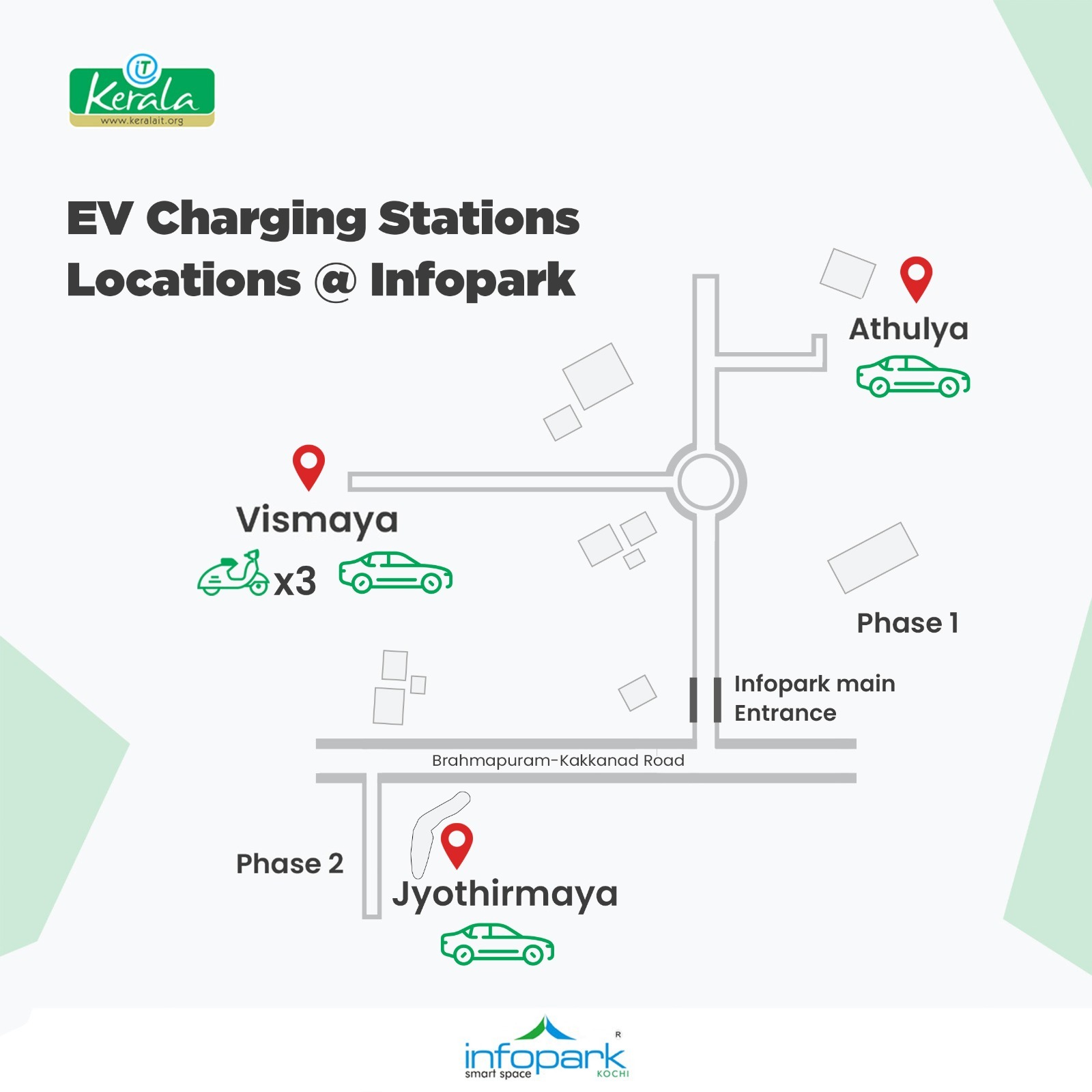 Have you jumped on the EV bandwagon? Don't worry. Infopark has fully functional EV chargers for 4-wheelers and 2-wheelers installed near various buildings in Infopark Kochi campuses (Phase 1-Vismaya, Athulya; Phase 2- Jyothirmaya), exclusively for Infopark employees. Know where they are, and how you can use them. Have a look at the charging stations at Infopark Kochi Phase 1 and Phase 2.