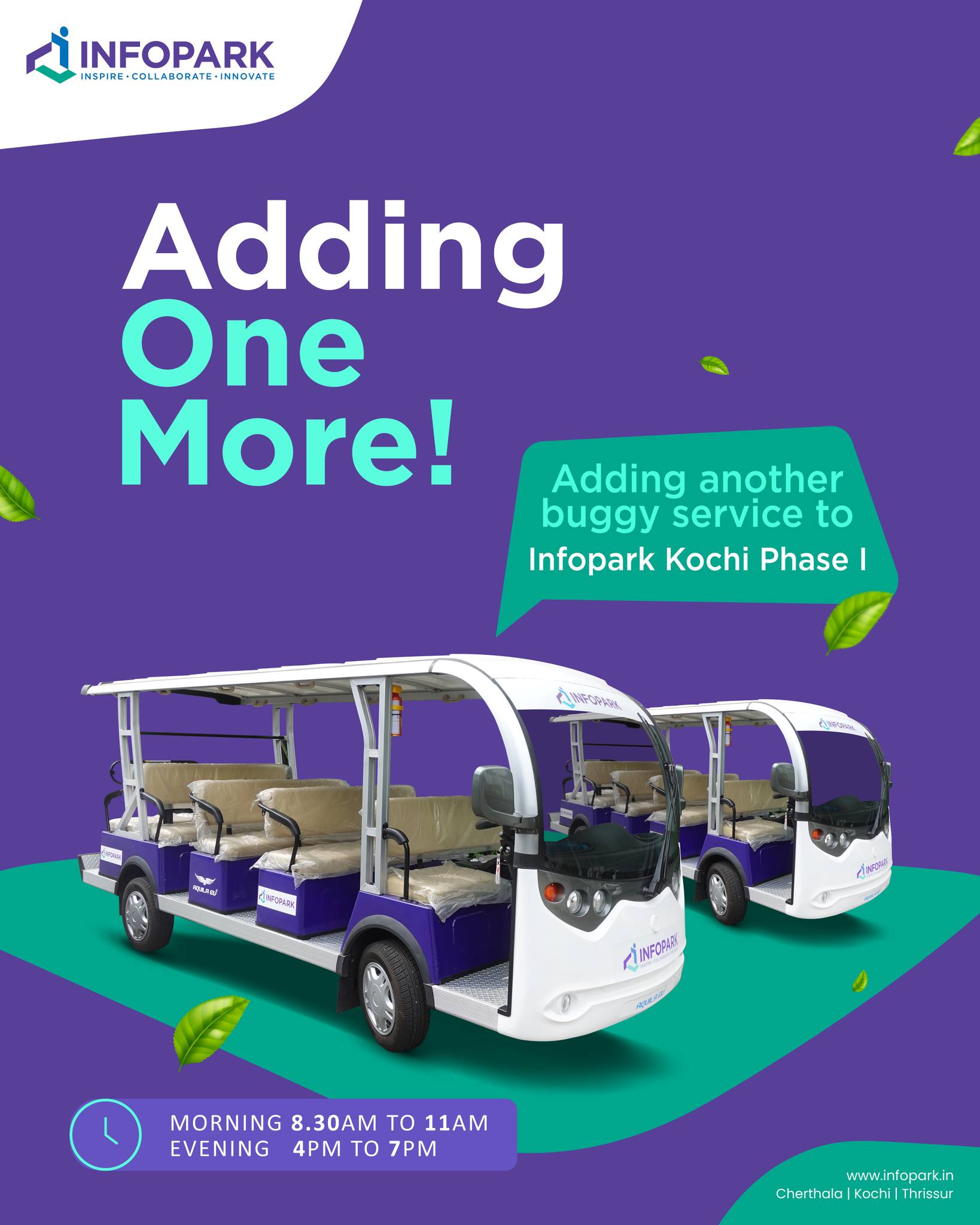 Infopark introduced an additional electric buggy service, providing free and eco-friendly transportation across Infopark Kochi Pha...